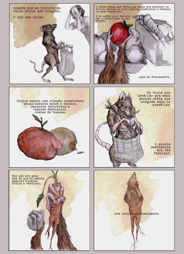 A terceira história é aquela que desenvolvi na minha tese. Conto sobre a última vez que vi meu avô, no seu leito de morte: ele foi incapaz de me reconhecer por conta das alterações que a testosterona trouxe no meu corpo. Resolvi representar essa situação de ininteligibilidade (a incapacidade do meu vô de ver em mim a neta que “ainda fui”) através de um monstro amorfo, que vai derretendo na medida em que não consegue provar a própria identidade nem quando mostra o RG.