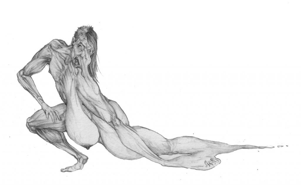 A ênfase no sofrimento também é uma constante muito limitadora, tanto no diagnóstico da transexualidade como na representação mainstream das nossas experiências. O que eu descubro observando o que a comunidade trans tem produzido, é formas de tocar temas complexos (como a solidão estrutural, a violência, o suicídio, etc) com humor inteligente e através de uma perspectiva criativa. O que eu tento fazer no meu trabalho é desviar das narrativas clássicas (a exemplo de: “eu nasci um homem preso no corpo de uma mulher”) e procurar o interstício das experiências de gênero, os lugares onde as identidades não estão tão sólidas, onde as narrativas se contradizem e não tentam “se explicar” para um público cisgênero. Para isso percebo que o emprego de figuras monstruosas e animalescas é uma aposta interessante da autorrepresentação, pois é capaz de dar contornos mais borrosos e múltiplos ao corpo trans.